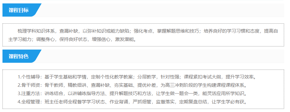 班型:不做大班,精准定位2-3人小班,及个化精品一对一,重教学,重提分培优。面向全川招生,成都生源/绵阳生源/周边及省外生源都有,成都范围各名校公立、私立都有:四七九本部,七高、嘉祥、成外、实外等。 服务及管理:学生除学科教学老师外,匹配一对一班主任服务:家校沟通、家长会召开、学生心理交流疏导、上课时间安排、变动协调,学科督学过关、及作业完成。 全日制课程设置 上课一知半解,跟不上复习节奏,概念公式记住了,考试却不会用,厌烦情绪浓,学习没信心,考试不及格; 缺乏学习效率,成绩在班上属于中等,离名校有差距,没系统学习方法,学习焦虑没头绪,期望提升; 成绩名列前茅,为保证顺利考进目标名校,急需提分抢分,考前冲刺,但自己提升有难度,需要加强巩固。