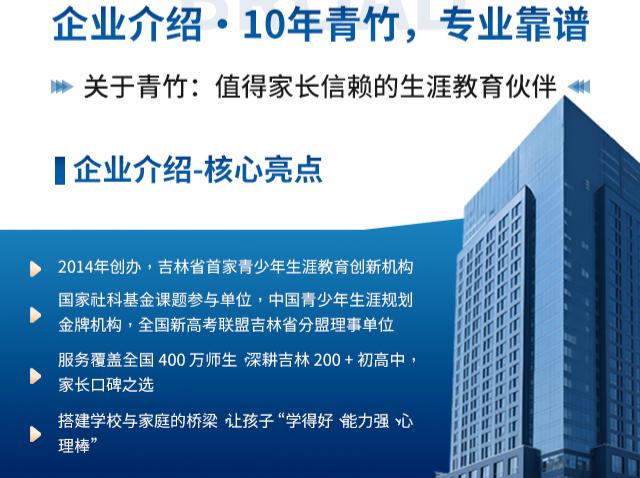 企业介绍-核心亮点 2014年创办,吉林省首家青少年生涯教育创新机构 国家社科基金课题参与单位,中国青少年生涯规划金牌机构,全国新高考联盟吉林省分盟理事单位 服务覆盖全国400万师生 深耕吉林 200+初高中家长口碑之选 搭建学校与家庭的桥梁 让孩子“学得好 能力强 理棒” 博大集团是在博大教育集团的基础上成立的,博大教育集团成立于2012年,2022年正式 更名为博大集团,同时集团业务从传统的教育业务,拓展为以教育为基本,互联网直播业 务为重点,文创旅游研学板块为载体,工程建设为衍生项目,新农业为长远战略布局,形成了一家全性的综合集团公司。公司总部位于吉林省长春市,在西安、广州、沈阳、哈尔 滨、深圳、衡水、天津、郑州、济南等地共设有16个分支机构。业务覆盖中高考全日制 学校和培训;中等和高等职业教育和技能培训;考研和公务员培训;智慧教育科技等。