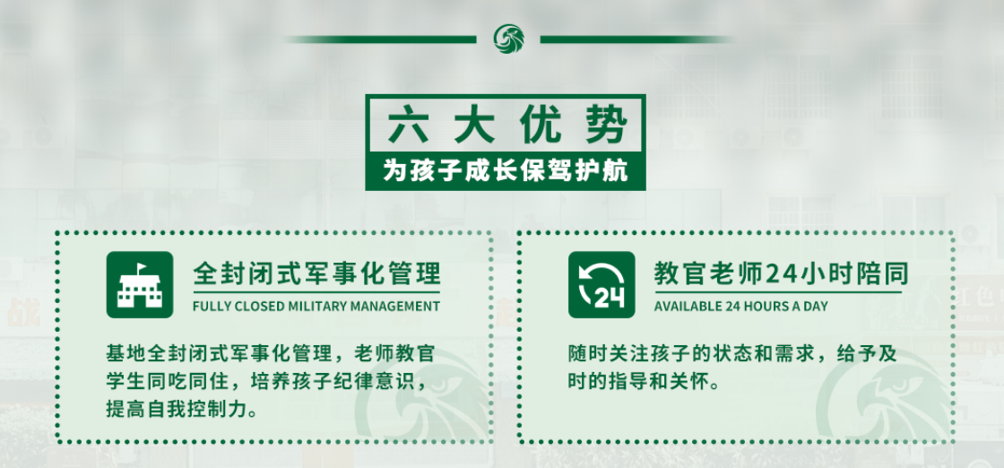 雷鹰特训⻘少年素质教育基地⼀所针对叛逆、厌学、沉迷⽹络游戏、夜不归宿、早恋、奢侈消费、亲情淡漠、⾃卑⾃恋、离家出⾛等⻘少年进⾏⼼理辅导、⾏为矫正、素质培养、着重亲情培养的特训基地。主要任务是:教育、转化、矫治具有严重不良⾏为的⻘少年,对⻘少年违法犯罪进⾏早期⼲预。经过多年的教培实践,从营地宗旨到教育理念,从育⼈环境到训练⽅式⽇趋成熟,逐步⾛上了素质教育现代化、科学化、正规化的轨道。