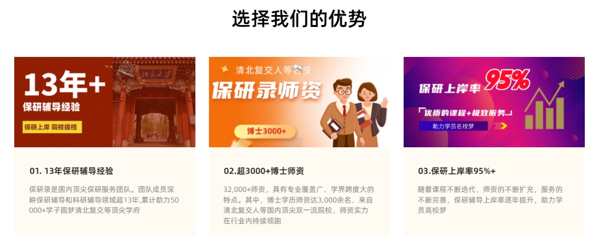 而在面试训练环节,他们则成为经验丰富的实战导师,通过模拟考核场景,剖析不同院校的提问逻辑,提升学生在高压环境下的学术表达能力。这种理论与实践相结合的指导体系,能帮助学生在短时间内掌握考核核心逻辑,实现从知识储备到应试能力的全面跃升。 更值得称道的是导师团队的诊断式培养模式。通过多维度评估,他们能精准定位学生的竞争优势与不足:既善于挖掘学术经历中的闪光点,将其转化为独特的竞争优势;又能针对科研训练、论文写作等薄弱环节,制定阶梯式提升计划。这种 “扬长补短” 的培养方式,如同为学生的能力提升安装了加速器 —— 让优势领域成为脱颖而出的制胜法宝,让薄弱环节转化为持续进步的动力源泉,最终在激烈的竞争中构筑起坚实的竞争壁垒。 选择与专业机构携手同行,本质上是为学术理想配备一套精密的导航系统。在信息繁杂、考核迷雾重重的保研之路上,这些专业力量如同明亮的灯塔,既能照亮前行的道路,又能指引正确的方向,让每一位追逐理想的学子,都能在科学规划与专业指导下,稳步迈向梦想学府的学术殿堂。 保研录,是北京宝研路教育科技有限公司旗下的高端保研辅导品牌,成立于2012年。由原知名头部保研公司创始人、保研领域顶级大咖李帅老师,携手保研辅导专家王会超、牛亚坤等核心团队成员打造。 公司核心团队汇聚了来⾃清华、北大等顶尖高校的教育名师,深耕保研辅导和科研辅导领域超13年,同时拥有2万+名校师资团队,通过以“保研上岸,院校提档”为目标倒推设计的课程体系、“把学生当己生”的极致负责的辅导团队,认真、专业、尽职尽责服务于每一名学员,综合保研上岸率高达98.99%。 公司总部位于北京海淀,毗邻北大湖畔和清华园,并在天津设立分部,逐走向全国。通过联合名校导师、顶级机构,携手全网知名教育IP,为每一名学子助力,让每一位家长安心。